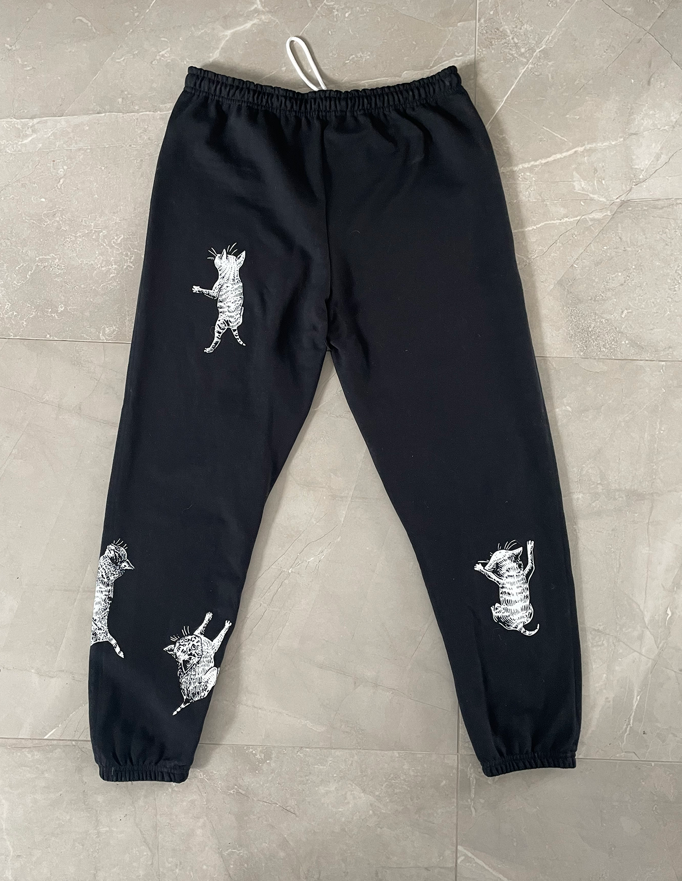 "Kitten Climbers" sweatpants, designed and screen-printed by Hellzen. Kittens are on the front and back of the sweatpants! Printed on black Gildan Heavy Blend pants (50% cotton, 50% polyester)