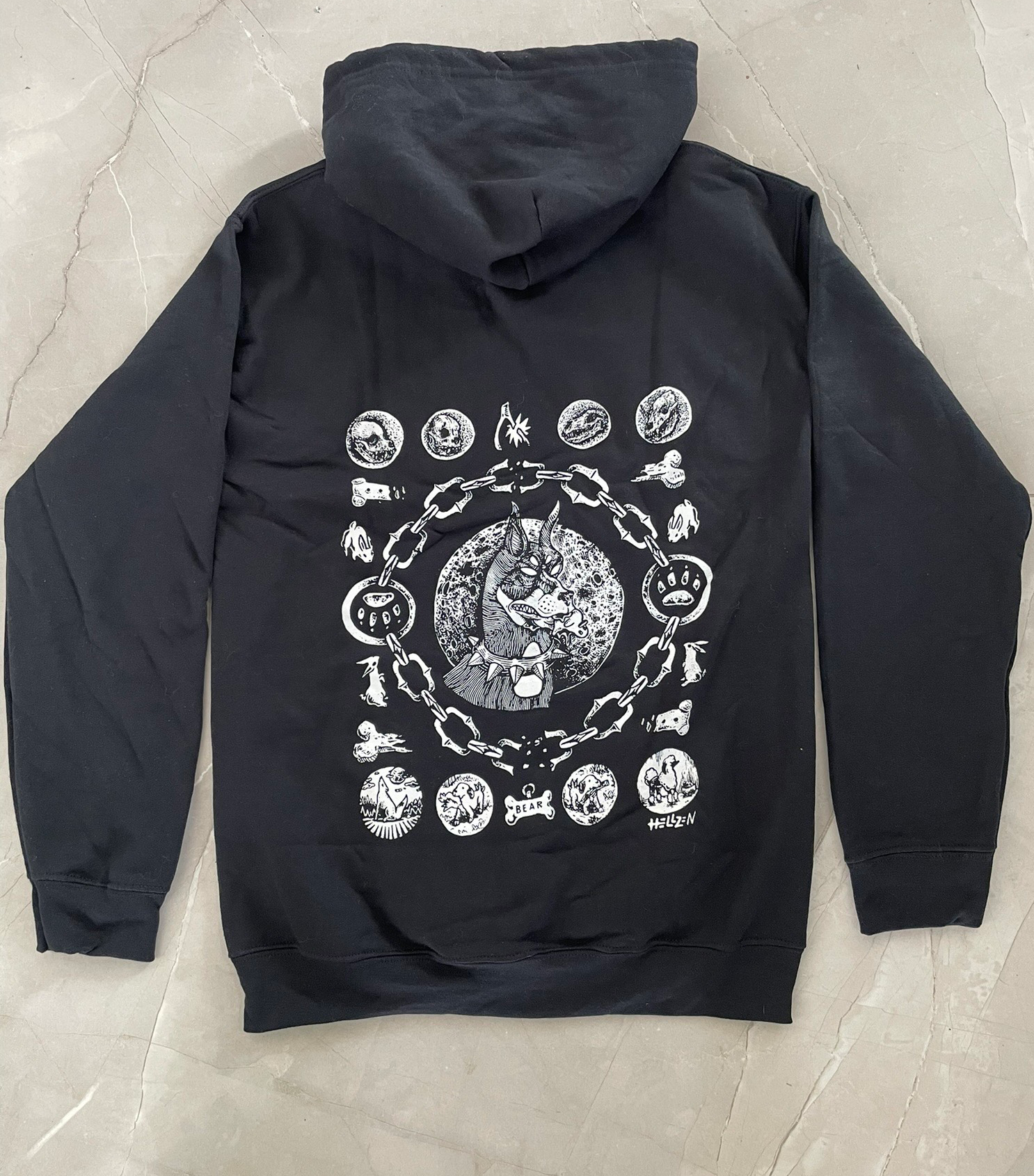 "A Dog's Life" zip-up hoodie, designed and screen-printed by Hellzen. Front and back print! Printed on black Gildan Heavy Blend zip-ups (50% cotton, 50% polyester)
