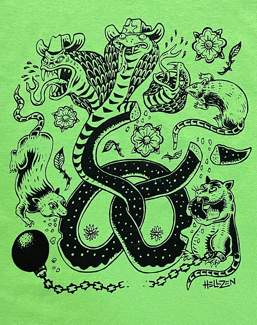 "Pretzel Rats" t-shirt, designed and screen-printed by Hellzen. Printed on slime green Gildan Heavy cotton tees (100% cotton)