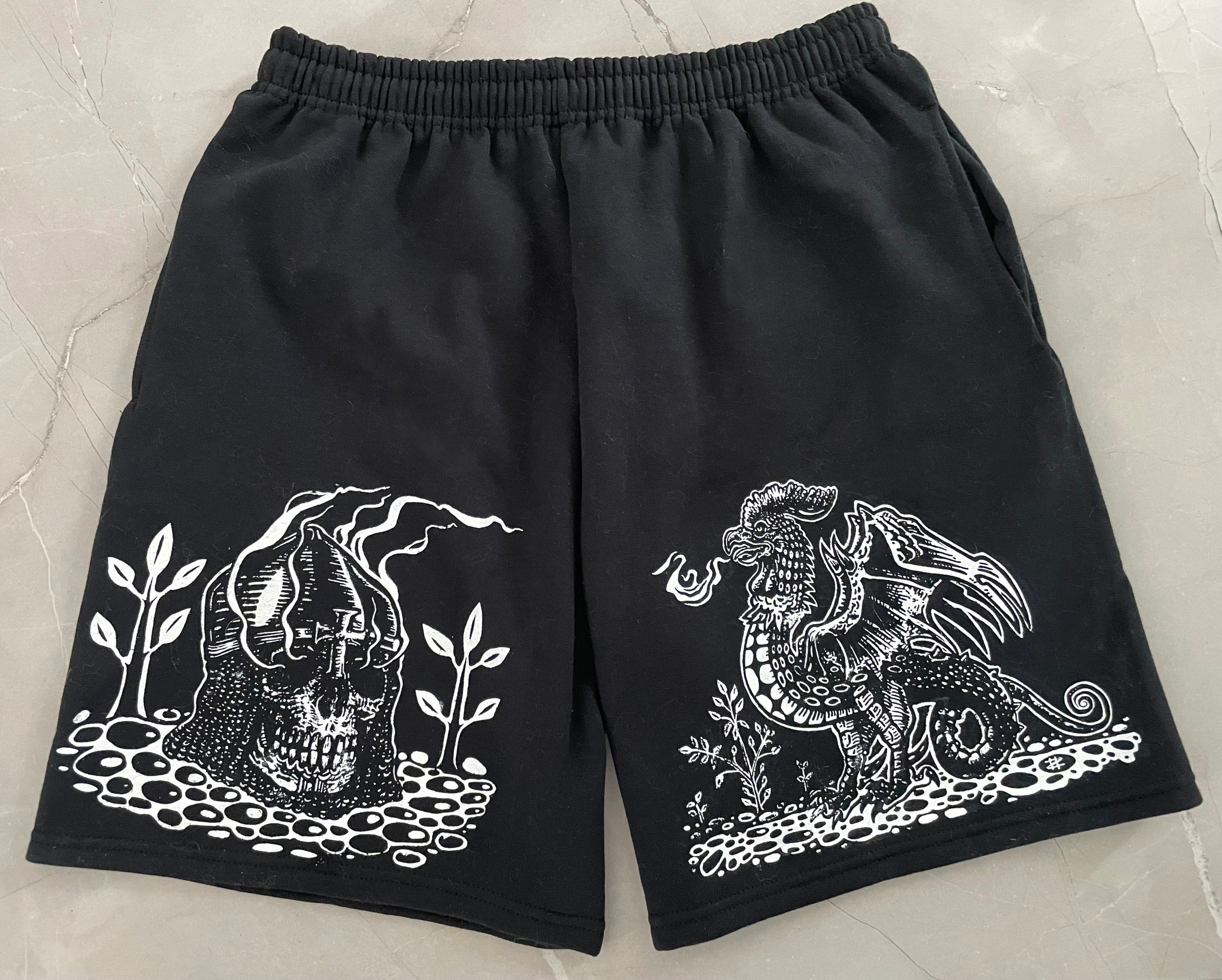 "Cockatrice" pocketed shorts, designed and screen-printed by Hellzen. Unisex Jerzees® Nublend Fleece Short (50% cotton, 50% polyester)
